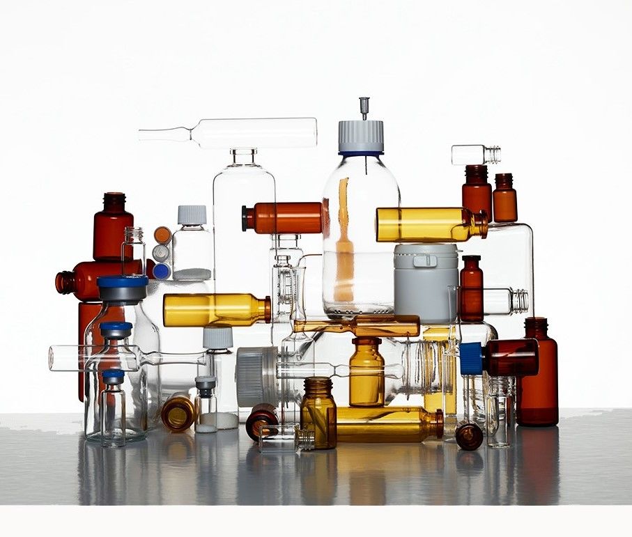En stor variation av förpackningar beroende på användningsområde. Även här finns glaset i olika kvaliteter och färger. Vanligen är injektions och infusionsglaset tillverkat i typ 1 glas, medans övrigt glas tillverkas i brunt, typ 3 glas.